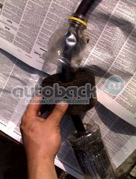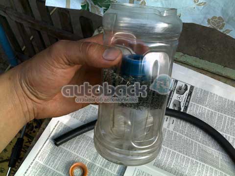 Сначала отсоединяем шланг от клапанной крышки и от впускного тракта, на отверстие оставшееся во впускном тракте нужно сделать любую заглушку (я брал технологическую заглушку от нового ВУТ), затем берем шланг нужной длинны(зависит от места расположения фильтра), я брал около 30 сантиметров, чтобы фильтр был на уровне корпуса воздушного фильтра, одеваем его на штуцер клапанной крышки и фиксируем при помощи хомута, дальше из корпуса фильтра тонкой очистки топлива, нужно достать фильтрующий элемент и одеть его на шланг, закрепив пластиковым хомутом.