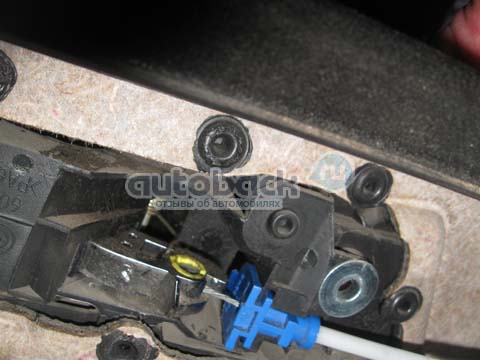 Потом я сняла тросик ручки открывания двери: вынула из пазов синюю защёлку, потянула трос вверх, высвободив его конец с цилиндром.