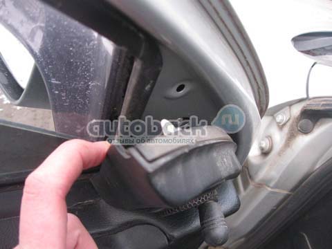 Первое, с чего я начала – аккуратно отстегнула декоративную угловую накладку, на которой установлен механизм регулировки зеркал. Для этого поддела его отвёрткой на себя, чтоб вынуть пластиковые пистоны, которыми она крепится к двери. Полностью снимать треугольник не надо, главное – освободить обшивку.